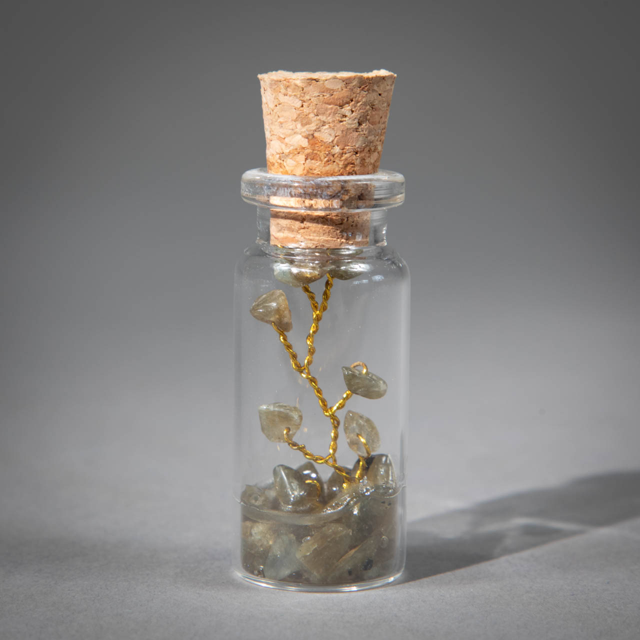 Description: Glass wishing bottle containing a wire-wrapped tree made from gold wire and labradorite pieces.