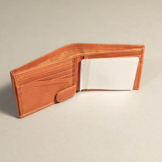 Description: Light brown smooth leather bi-fold wallet with 11 card slots, 1 clear ID slot, coin compartment, cash compartment, and removable clear insert.