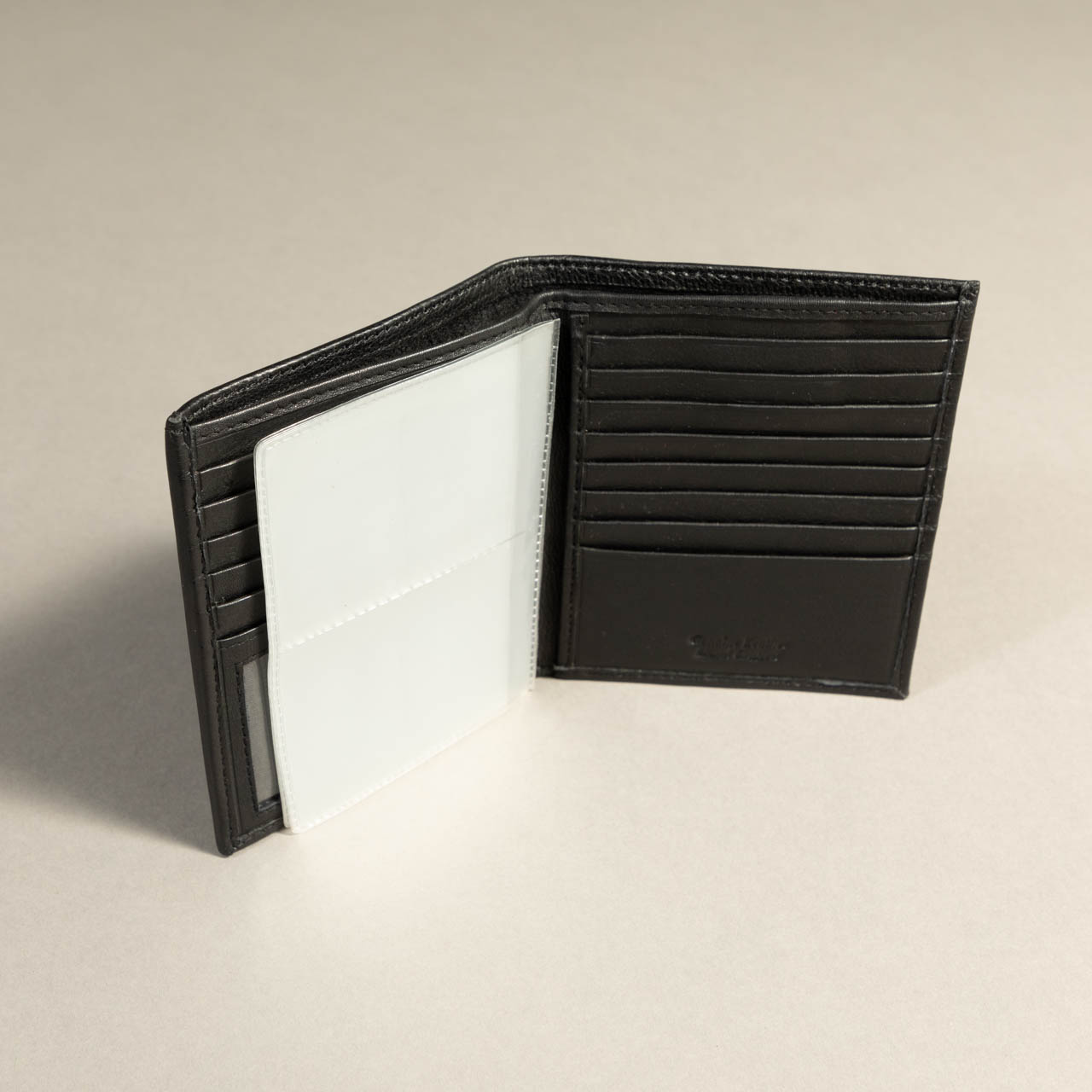 Description: Black smooth leather bi-fold wallet with 13 card slots, 1 clear ID slot, cash compartment, and clear removable insert.