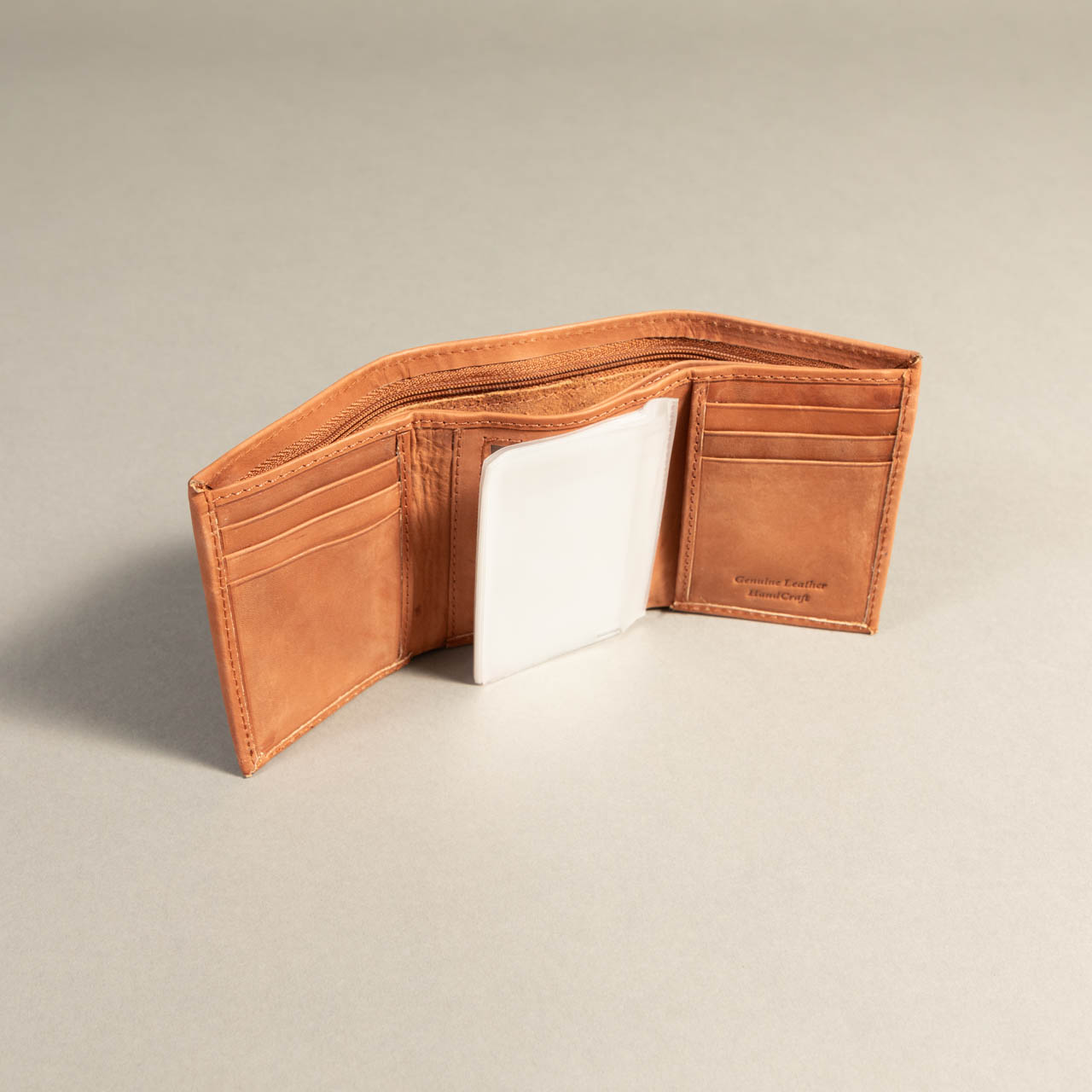 Description: Light brown smooth leather tri-fold wallet with 6 card slots, one clear ID slot, cash compartment, and clear removable insert.