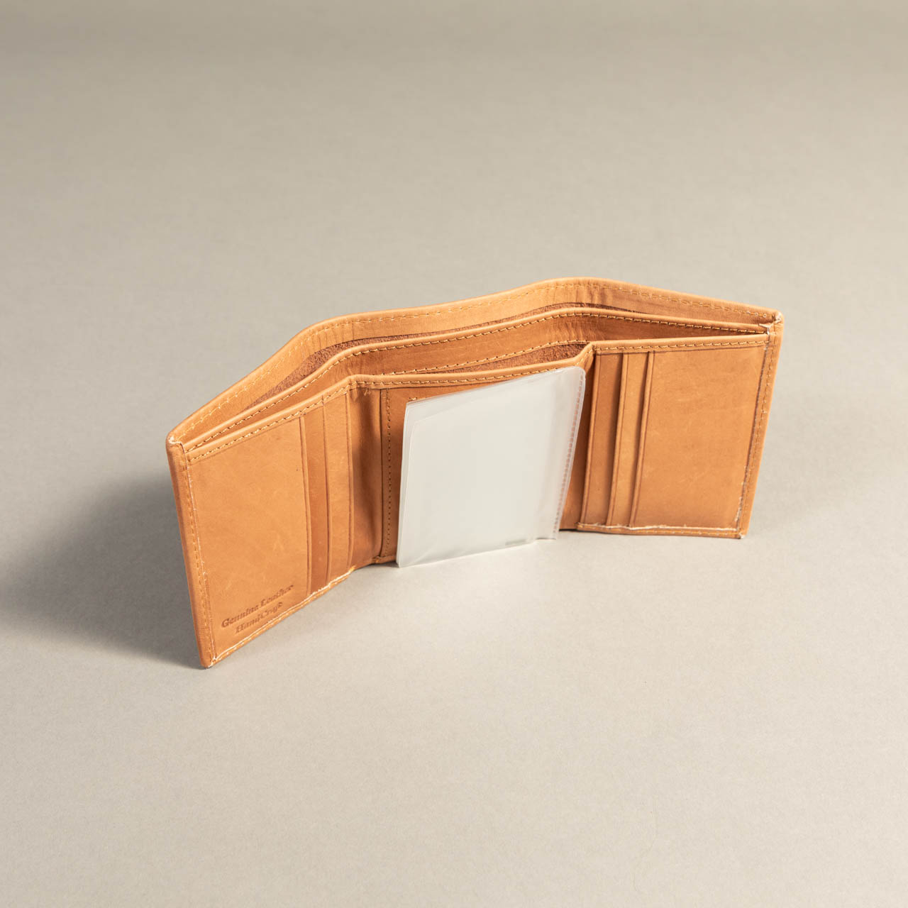 Description: Light brown smooth leather tri-fold wallet with 6 card slots, 1 clear ID slot, cash compartment, and clear removable insert.
