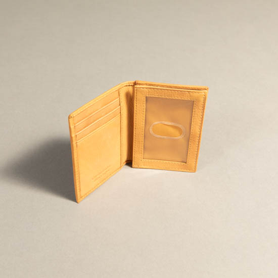 Description: Tan smooth leather credit card wallet with three card slots, 1 clear ID slot, a small cash compartment, and a removable clear insert.