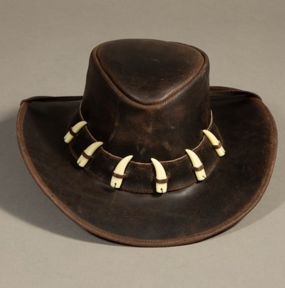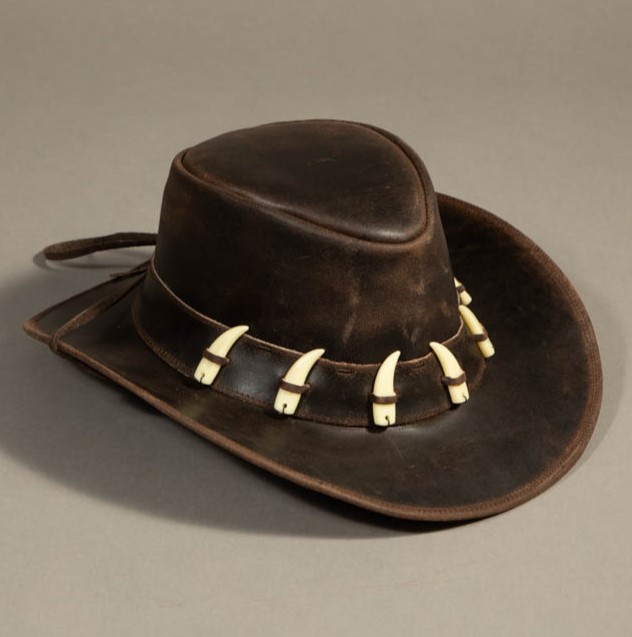 Description: Brown rough leather hat with crocodile teeth along the rim.