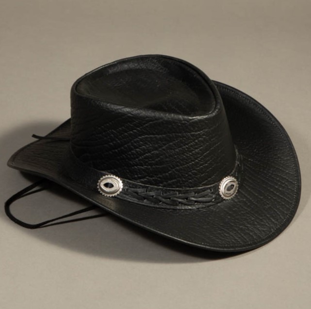 Description: Crocodile embosssed black leather hat with conchos and leather braid band along the rim.