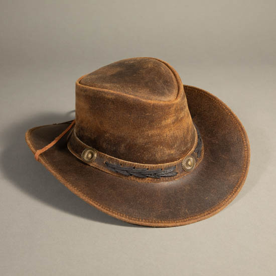 Description: Camel rough leather finish hat with a concho and braided leather band.