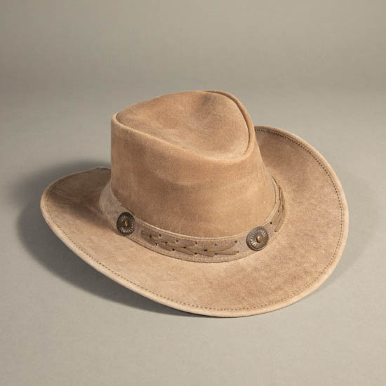 Description: Gray rough finish leather hat with a concho and braided leather band.